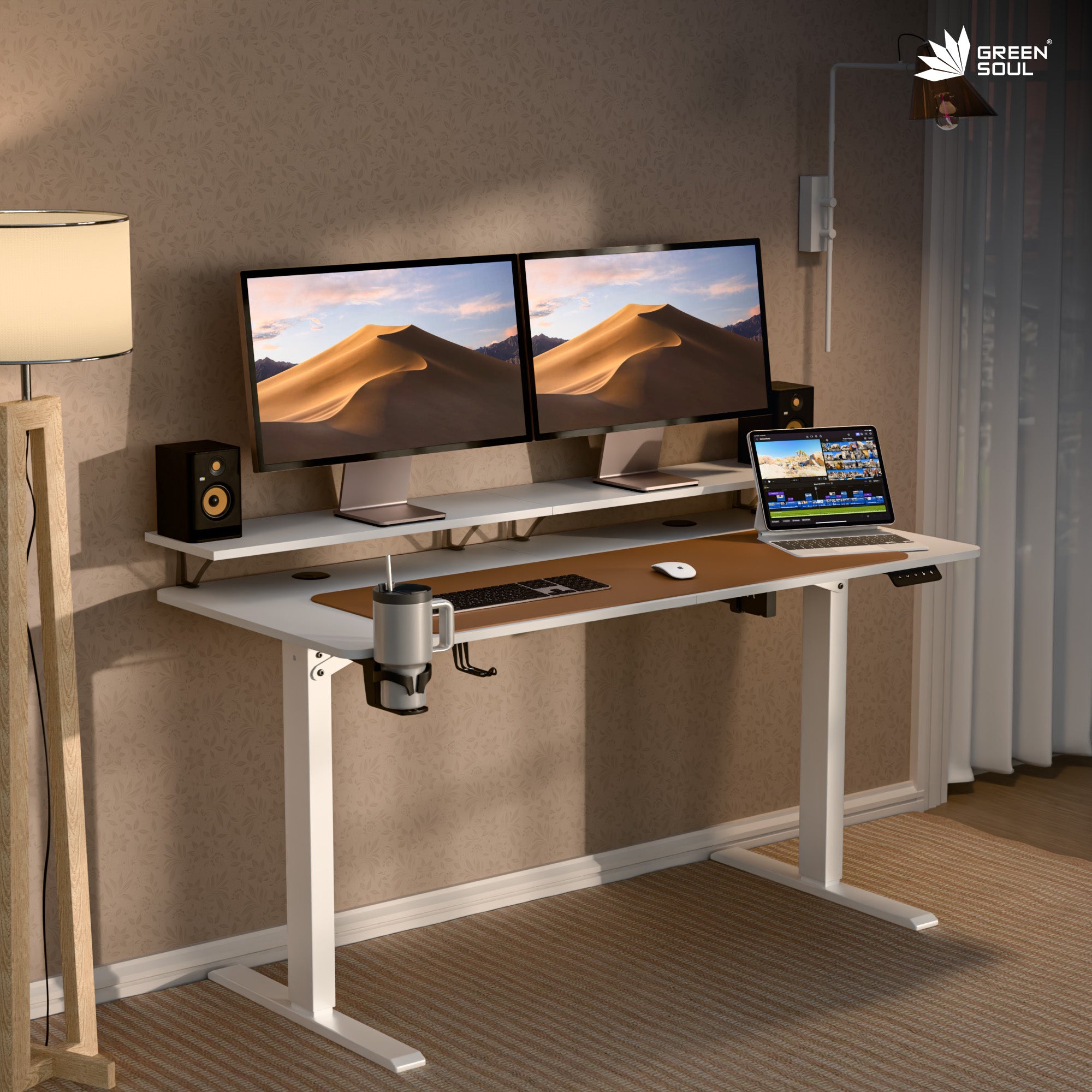 Introducing the Green Soul Elevate Electric Height Adjustable Table - The perfect addition to your home, office or gaming setup. This table is packed with features, including an electric height adjustment mechanism that can be controlled through a digital screen with a memory preset feature. The table's height can be adjusted between 72-117 cm, making it perfect for both sitting and standing positions.