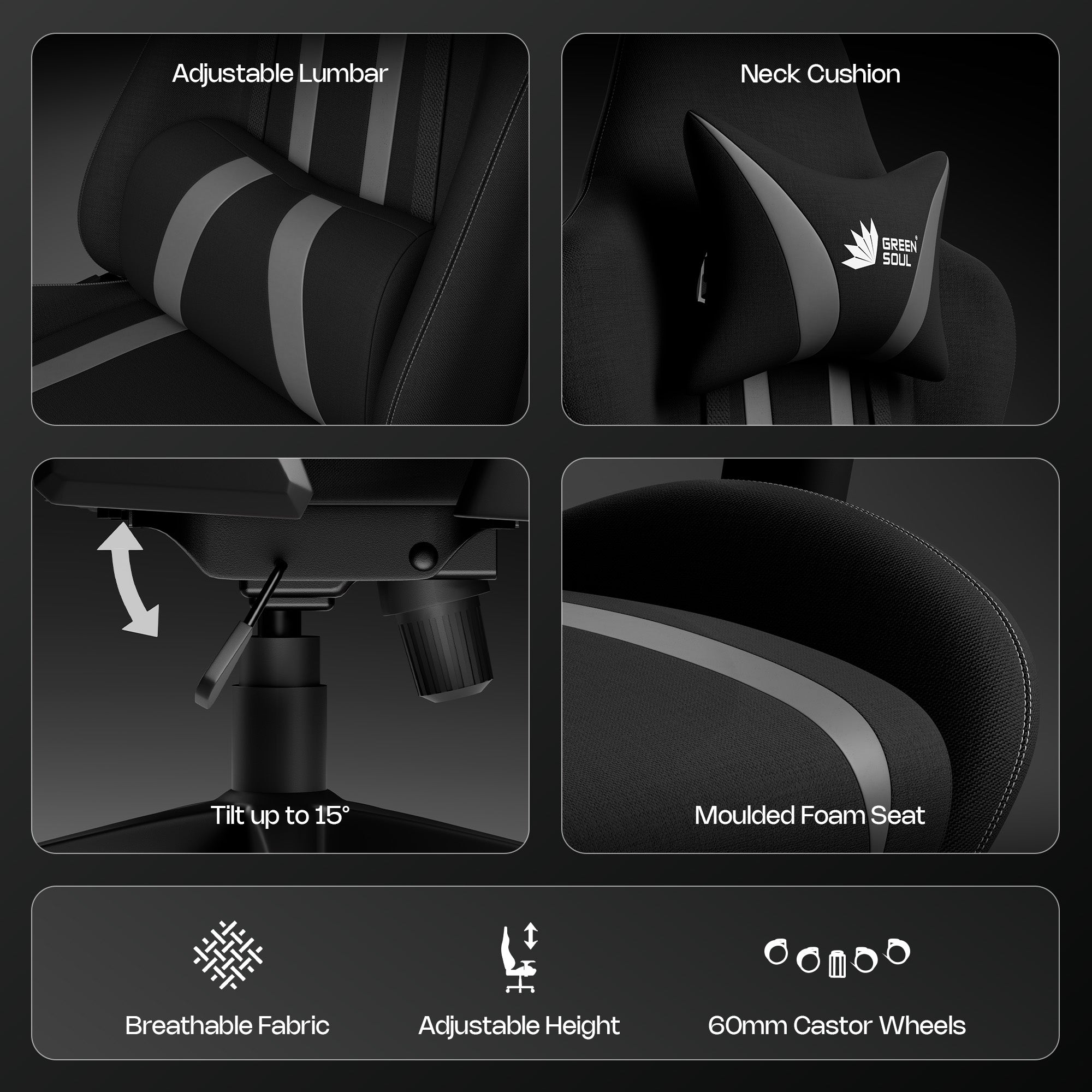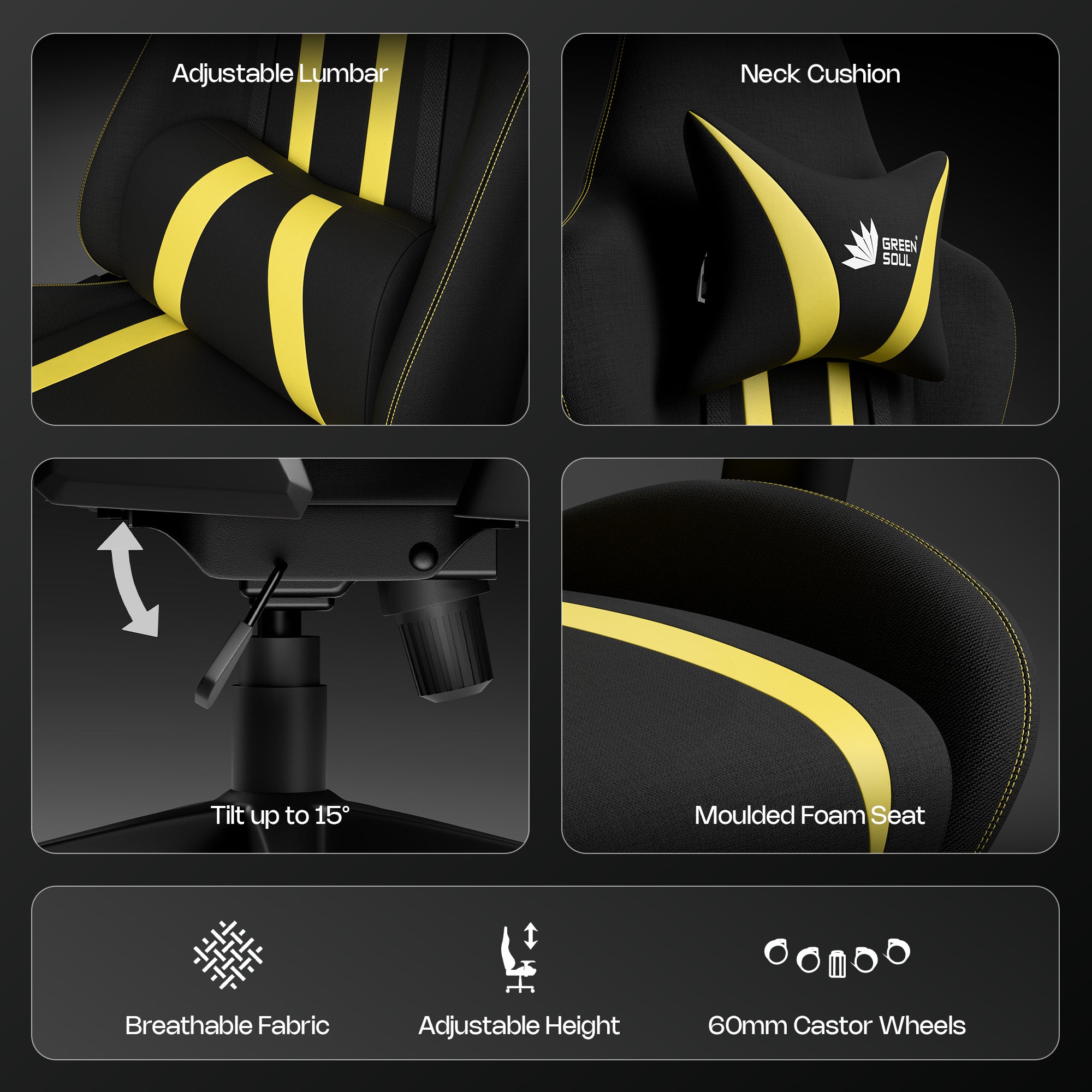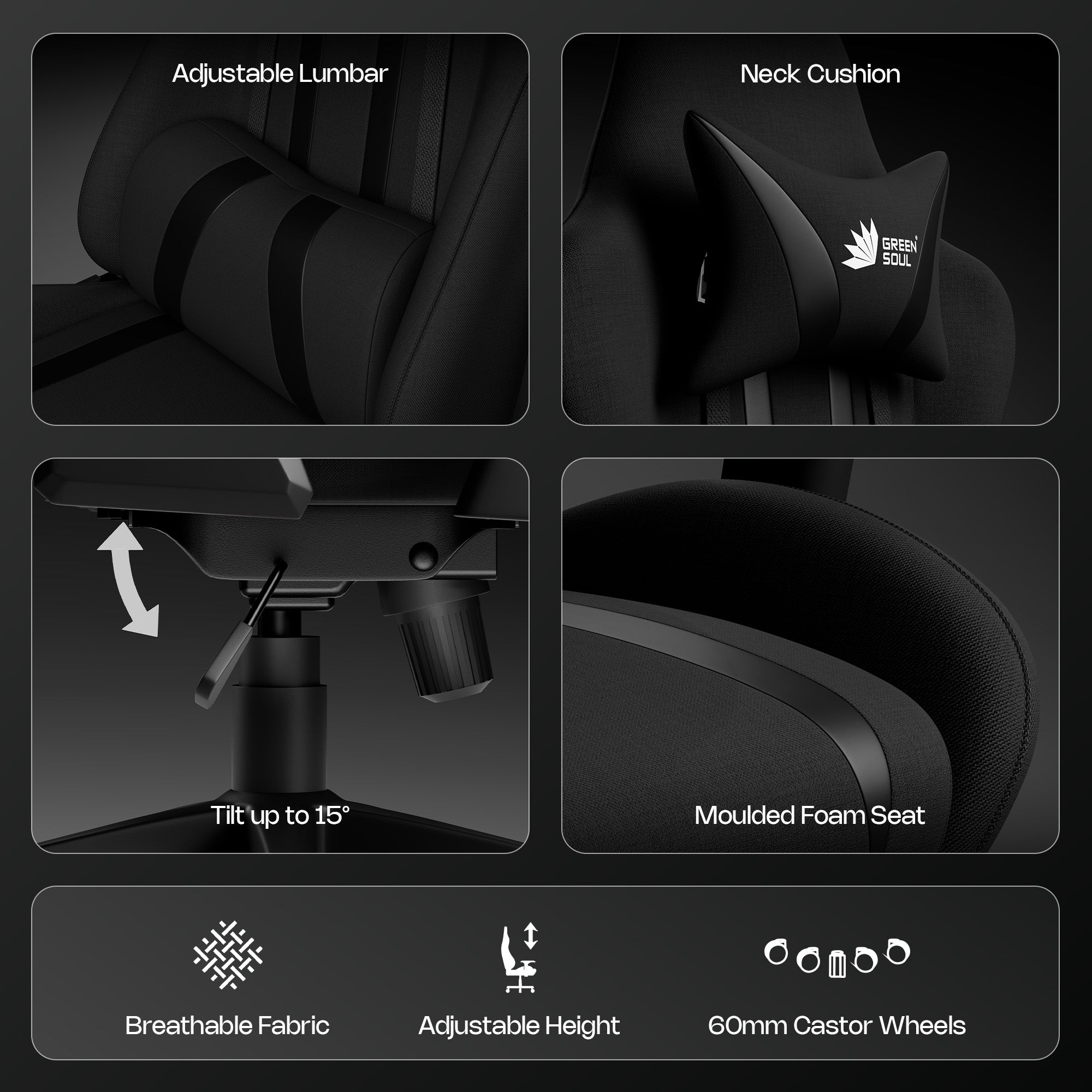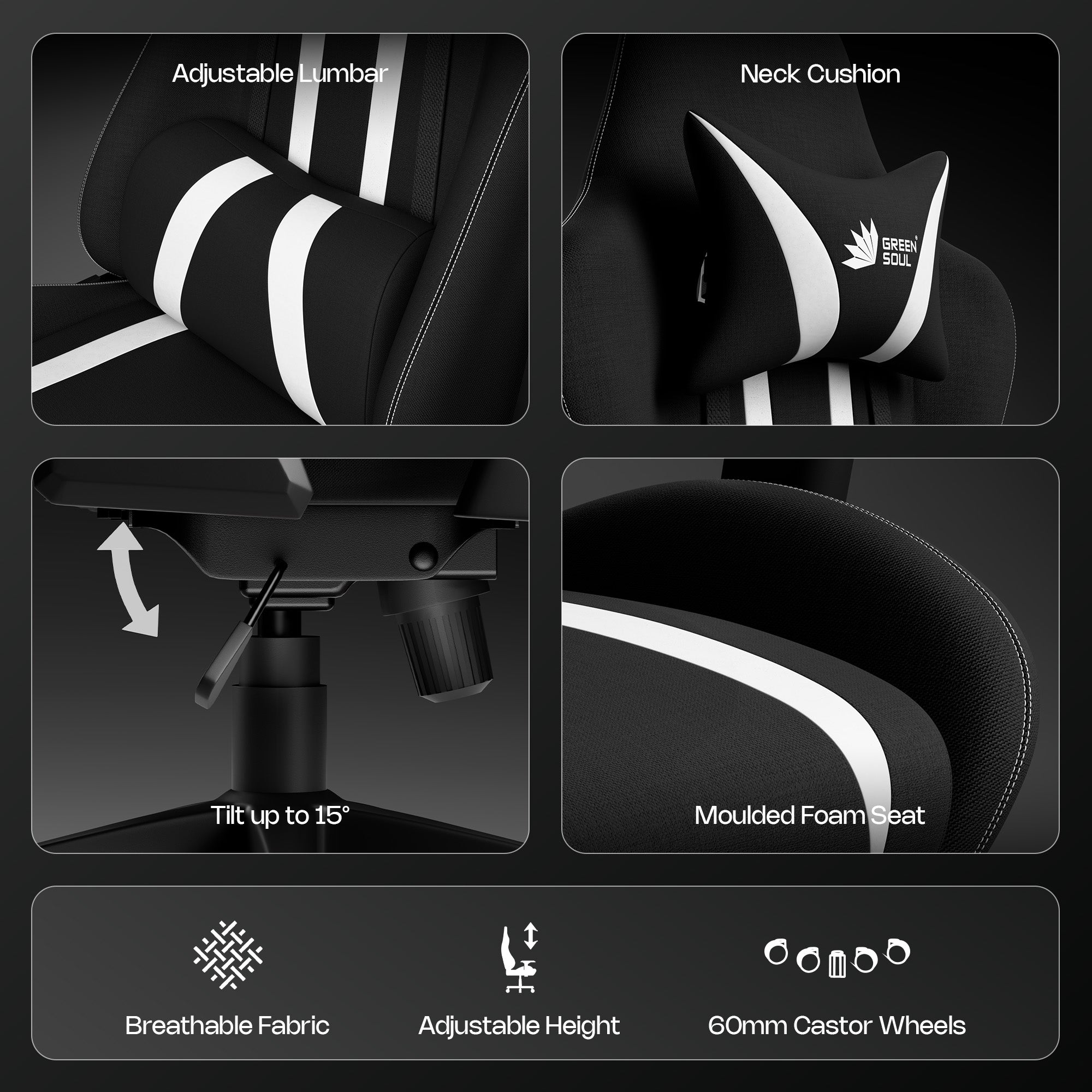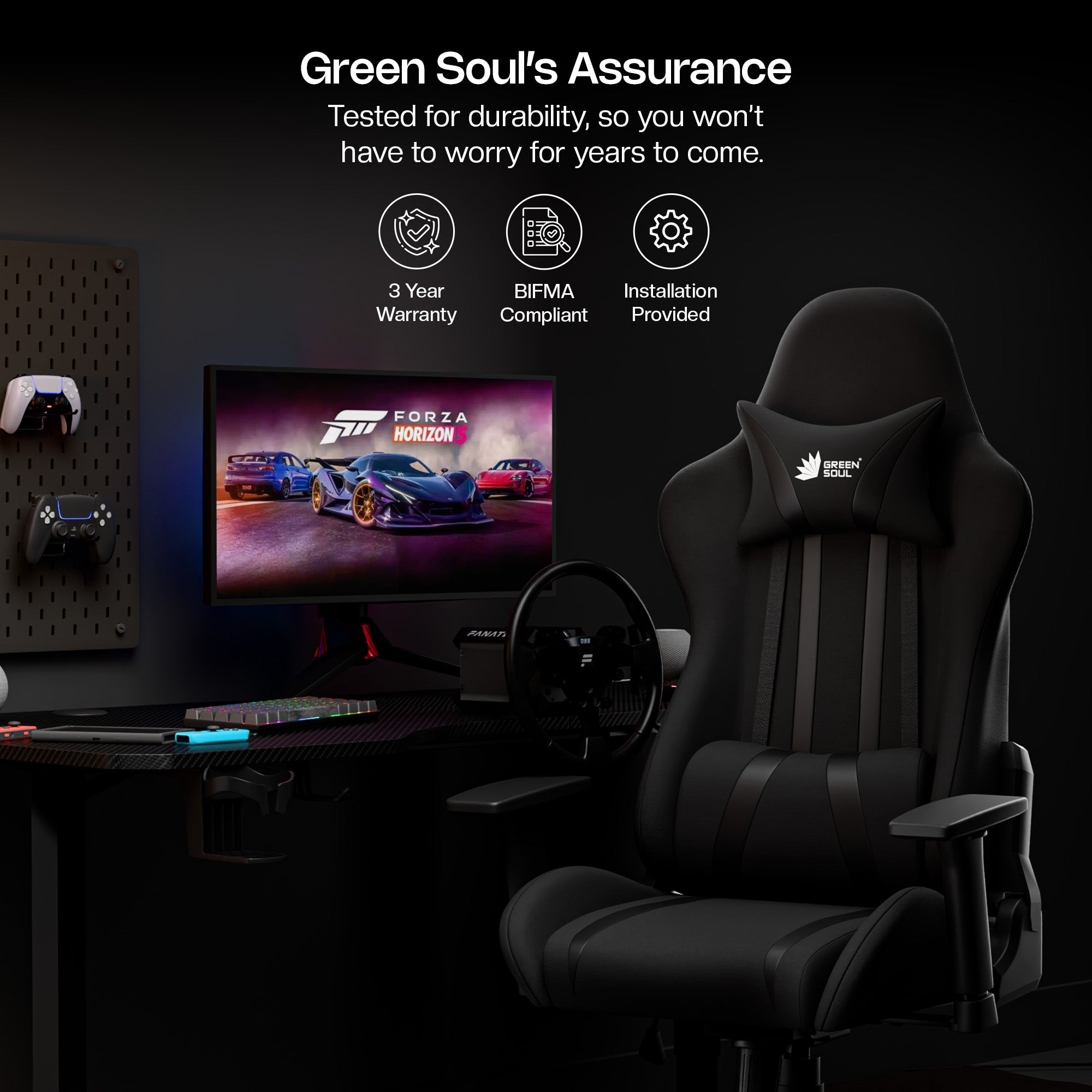 Experience the perfect blend of comfort, performance, and style with Green Soul's Beast Ergonomic Gaming Chair. Designed for long hours of gaming or work, this chair combines world-class ergonomics with a sleek racing seat design to keep you supported and focused. The high-quality fabric and PU leather upholstery offer both durability and luxury, while the heavy-duty metal base and PU wheels ensure long-lasting stability and smooth mobility. With a fully adjustable recline of up to 180°, customizable armrests, and supportive pillows, this chair adapts to your body so you can play harder, work smarter, and relax better.