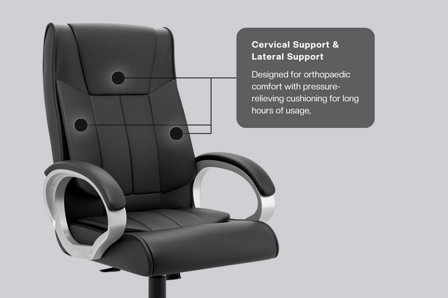 This ergonomic boss office chair is designed for ultimate comfort and support. It features armrests, contoured seat cushioning with pressure point technology, and 2-inch in-built Stationary Crevice Cushioning for targeted hip, lower back, and muscular relief. Its flexible backrest includes a tilt mechanism with height adjustment and a butterfly tilt rocking function for personalized support. Crafted with high-quality breathable leatherette, it provides both durability and a sleek appearance for long hours of use. Premium features with a 3 year quality asuurance at an unbeatable value.