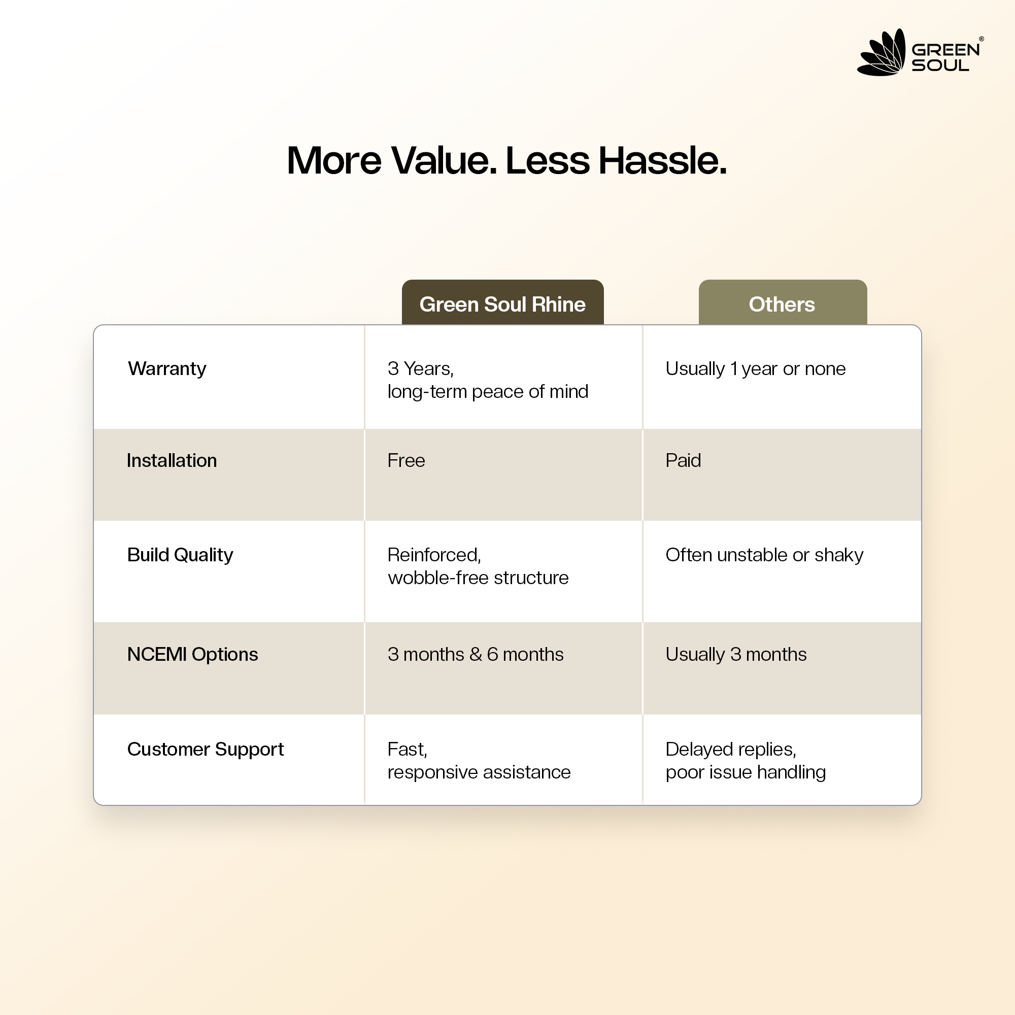 - 5. The product is easy to assemble and comes with the tools required to assemble the product. In case you need paid installation support from Green Soul, please call our Customer Care Team
