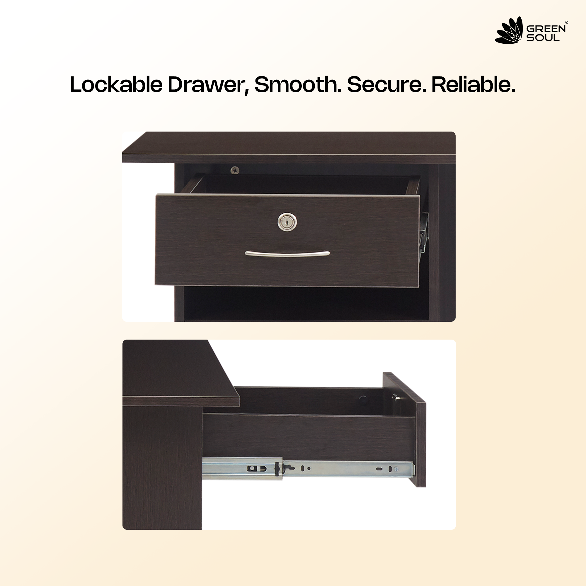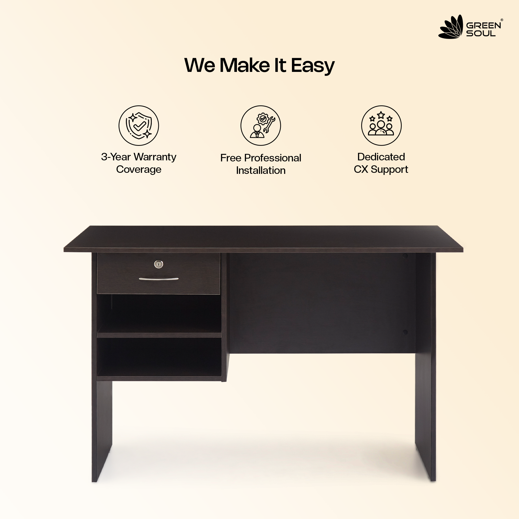 Introducing the Green Soul Premium Rhine Study Table - the perfect writing and computer table for optimizing productivity and inspiring creativity. Made of premium quality engineered wood and robust particle board, this study table is built to last. The 15mm thickness ensures durability and stability, while the classic wenge colour finish with a sleek suede texture adds sophistication to any space. With a surface top, 1 drawer, and 2 shelves, this study table provides ample storage space. The honey-comb protection on the corners and sides of the carton box ensures damage-proof packaging, and the table's 65kg weight capacity ensures stability. At Green Soul, we prioritize safety and quality. Our study table is free from toxins, chemicals, burrs, and sharp edges, and comes with a 3-year limited warranty against manufacturing defects. To keep your table looking its best, we recommend using a dry cloth to wipe it clean. Do not move the table without dismantling it and avoid using water or placing hot items on it. Upgrade your workspace with the Green Soul Premium Study Table - available now on Amazon. Order today and experience the difference in your productivity and creativity