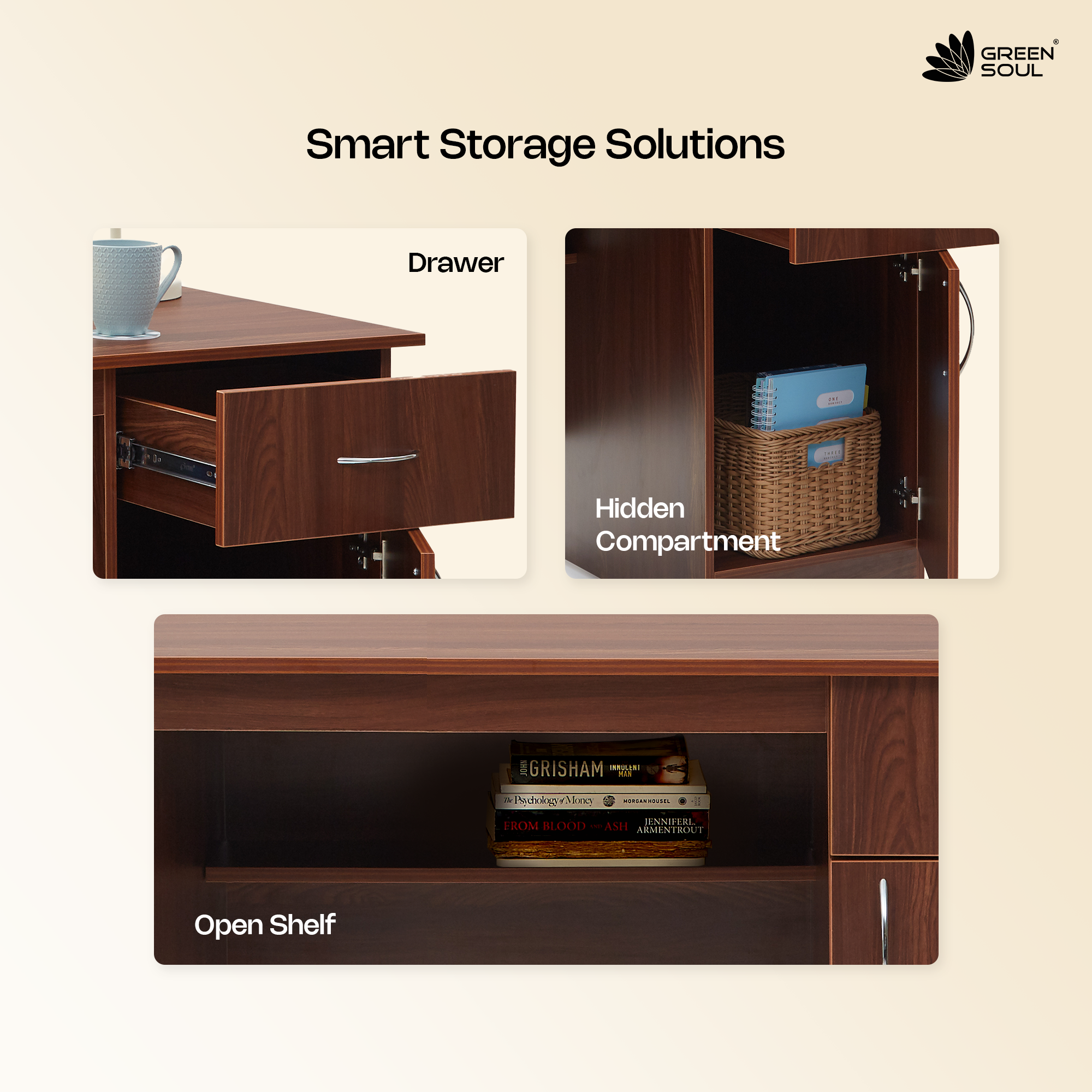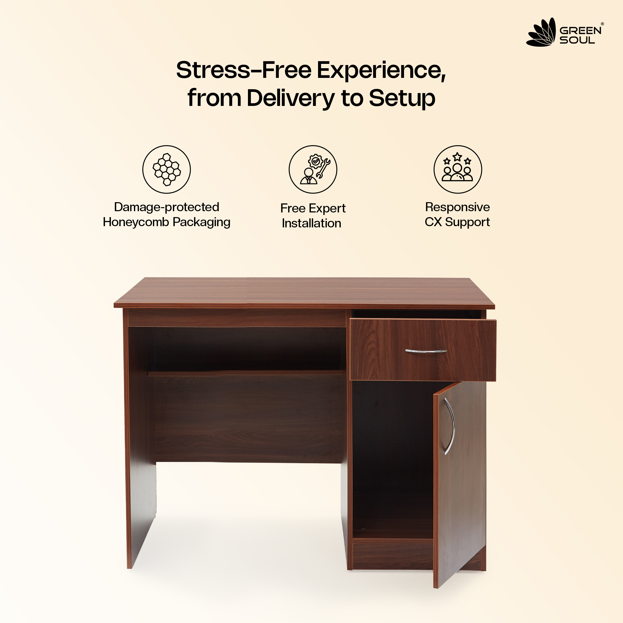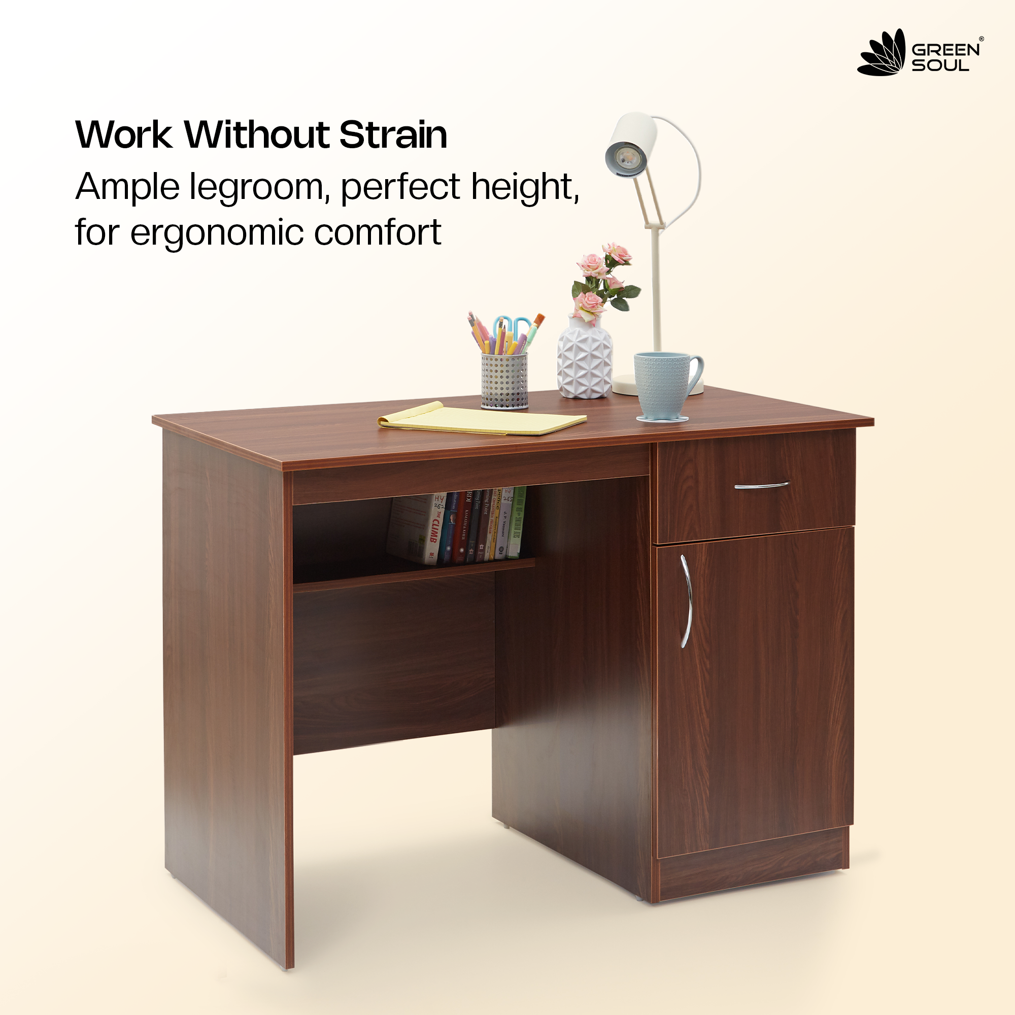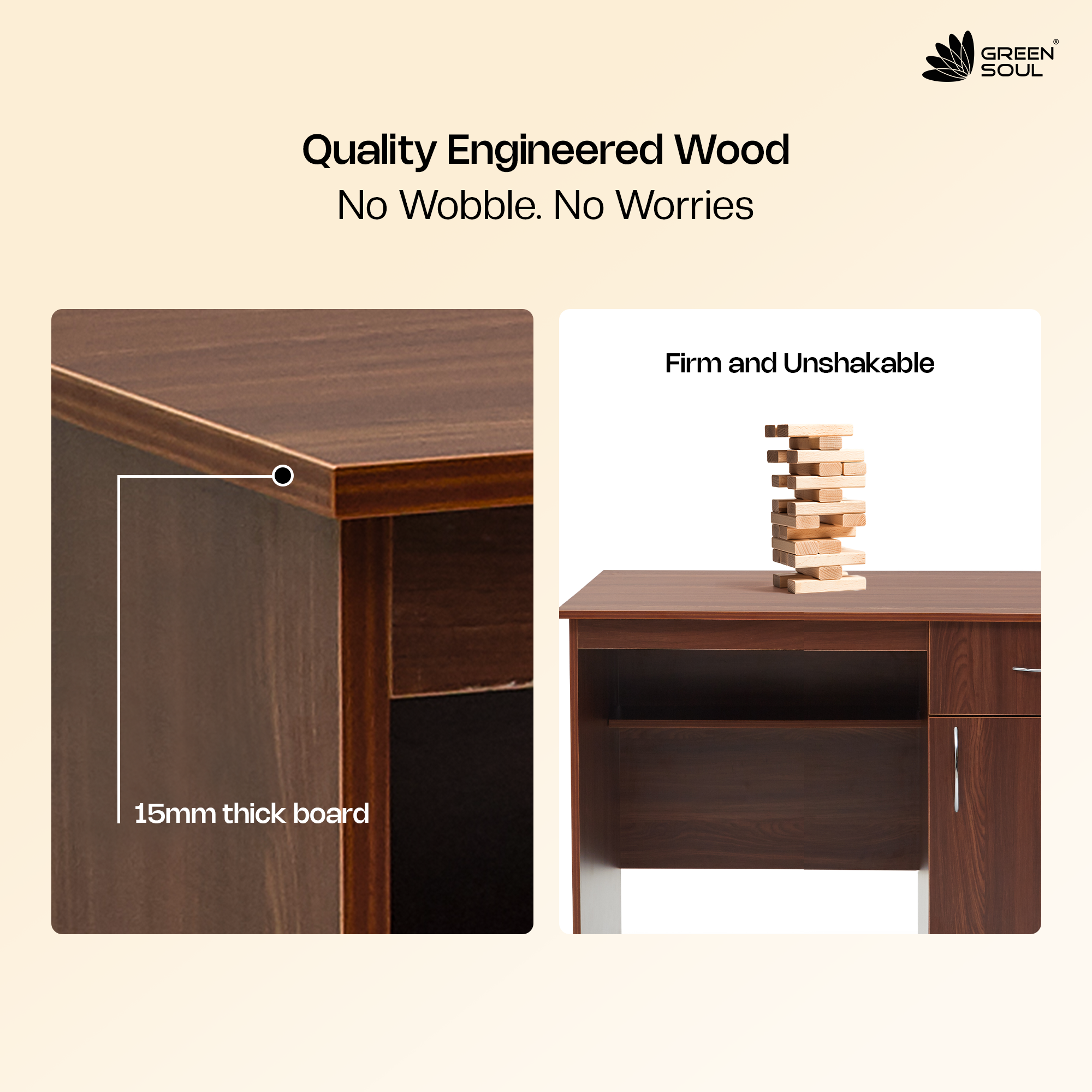 Introducing the Green Soul Premium Venue Go Study Table - the perfect writing and computer table for optimizing productivity and inspiring creativity. Made of premium quality engineered wood and robust particle board, this study table is built to last. The 15mm thickness ensures durability and stability, while the classic Rolex Brown finish with a sleek suede texture adds sophistication to any space.
