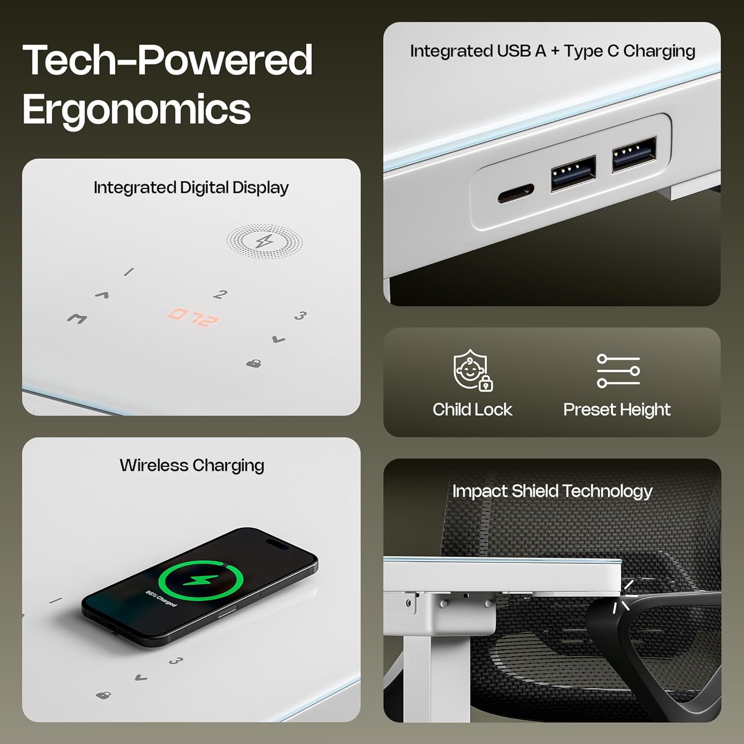 - Tech-Powered Ergonomics: Customize your posture with the digital touch panel and memory presets for ideal sitting and standing heights. Stay powered with wireless charging and USB ports. Impact Shield ensures safe transitions, while child lock supports more mindful workdays.