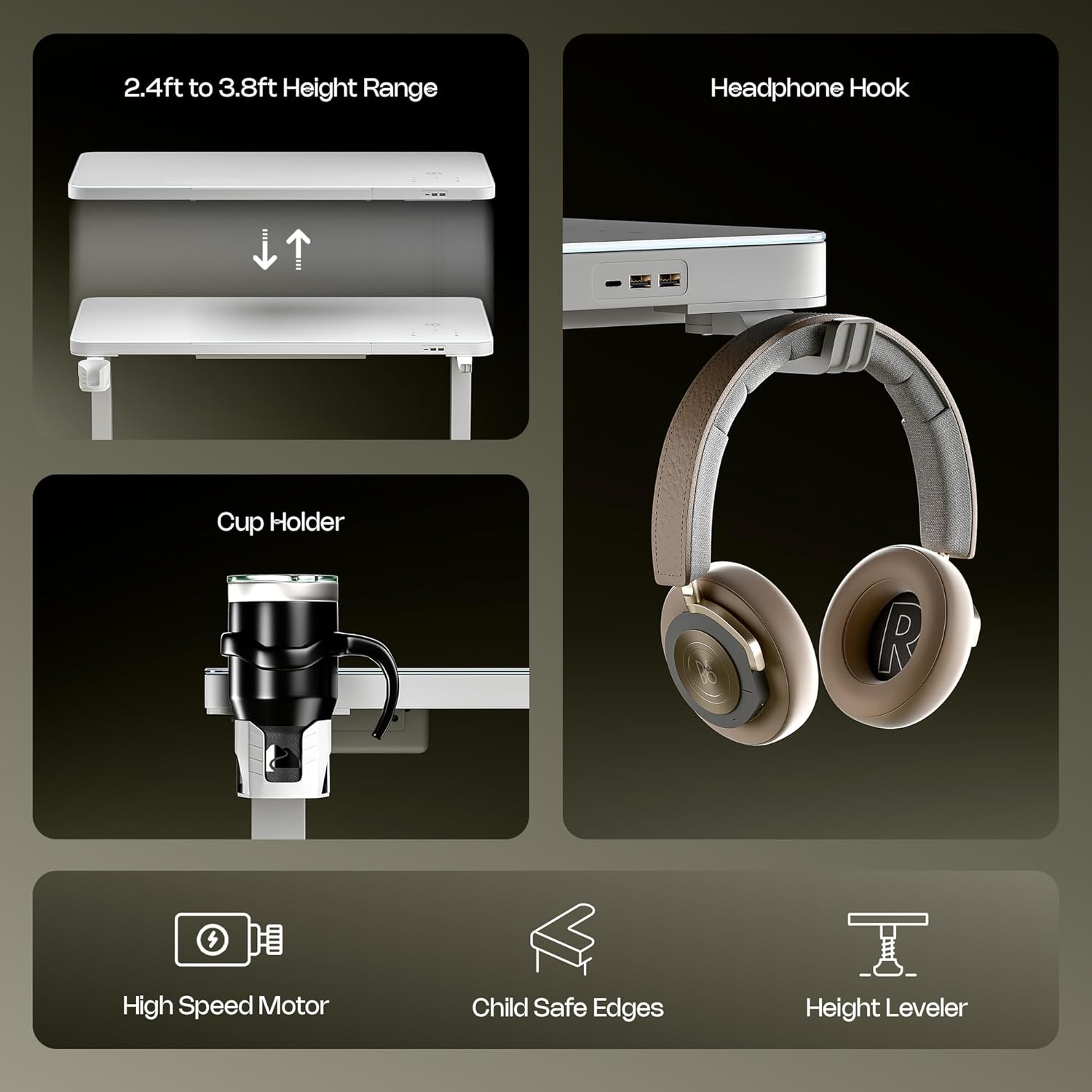 - Additional Utility features: Comes with in-built cup holder and headphone hook for easy access to your daily utilities. Integrated height stabilizer for increased stability on every surface. Designed with child-safe edges for an added layer of thoughtful safety.