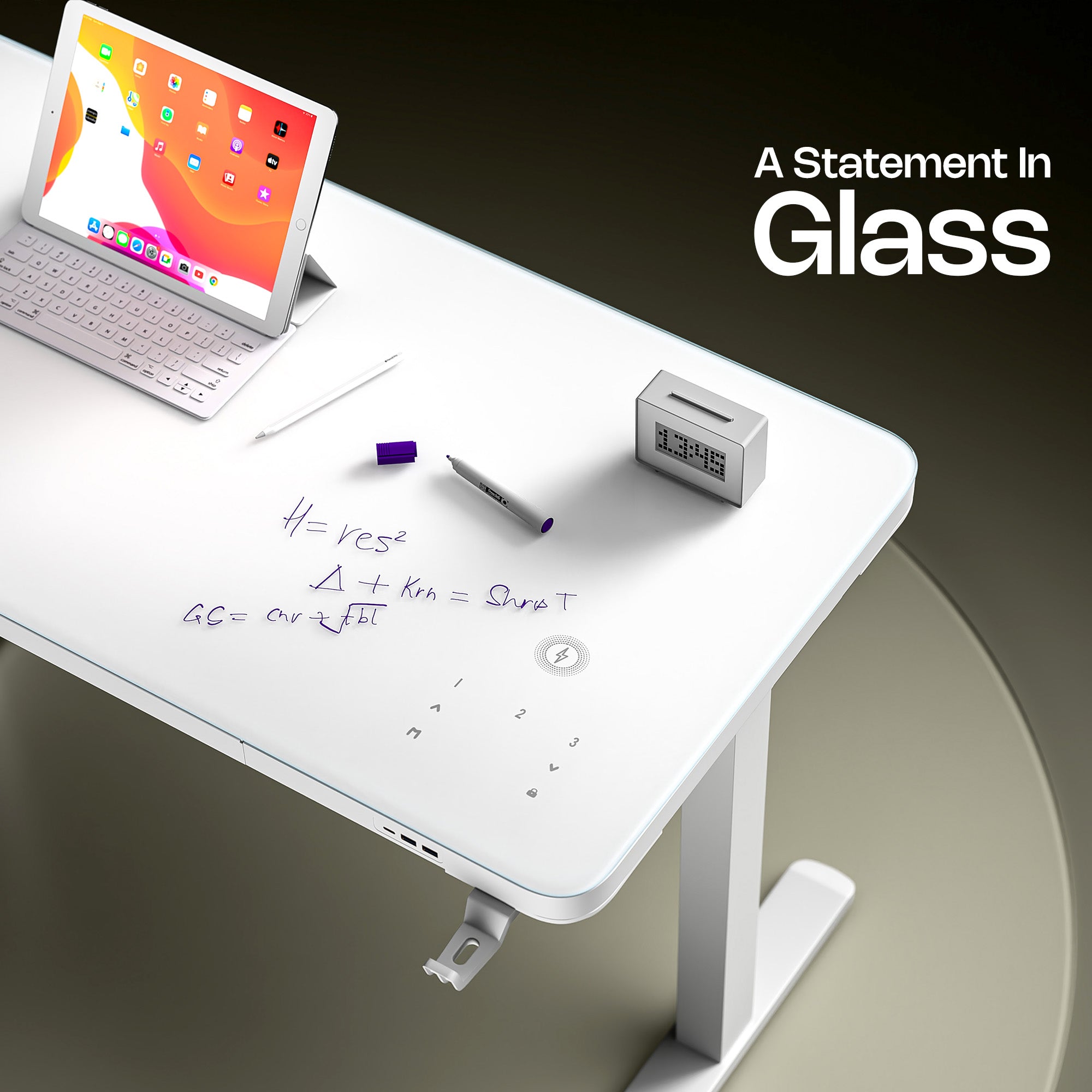 - Premium Glass Table Top: Prism isn't just a table—it's a centerpiece. With a premium tempered glass top resting on a sleek white frame, Prism blends modern minimalism with lasting durability. Its clean, all-white aesthetic elevates any workspace, making it ideal for those who demand both style and substance. The table top has a writable surface designed to take quick notes with a whiteboard marker.