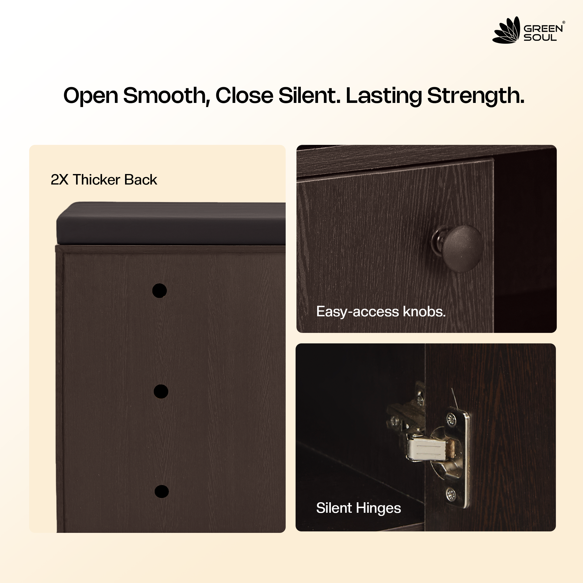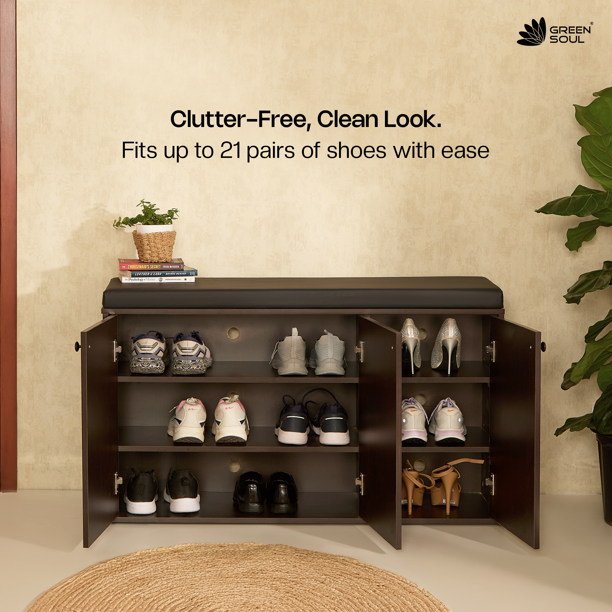 - Seating Comfort: This wide-format wooden shoe rack with cushioned seating offers a premium sitting experience with its thick foam and leatherette finish. Perfect for busy mornings, it provides a stable surface to sit while getting ready.