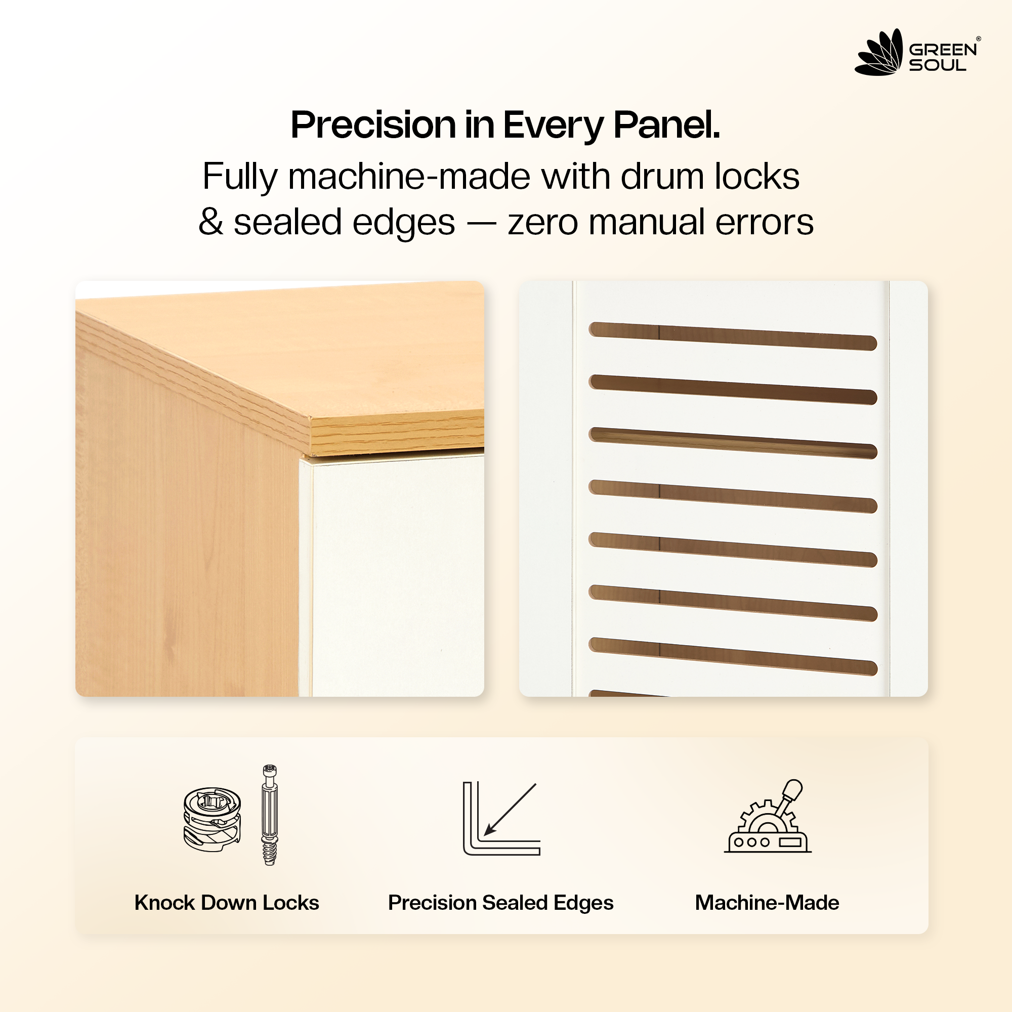 - Easy Assembly: Built for convenience with precision-cut panels, knock-down drum locks, and soft-close hinges. The fully machine-made structure ensures quick, secure setup without wobbles or alignment issues.
