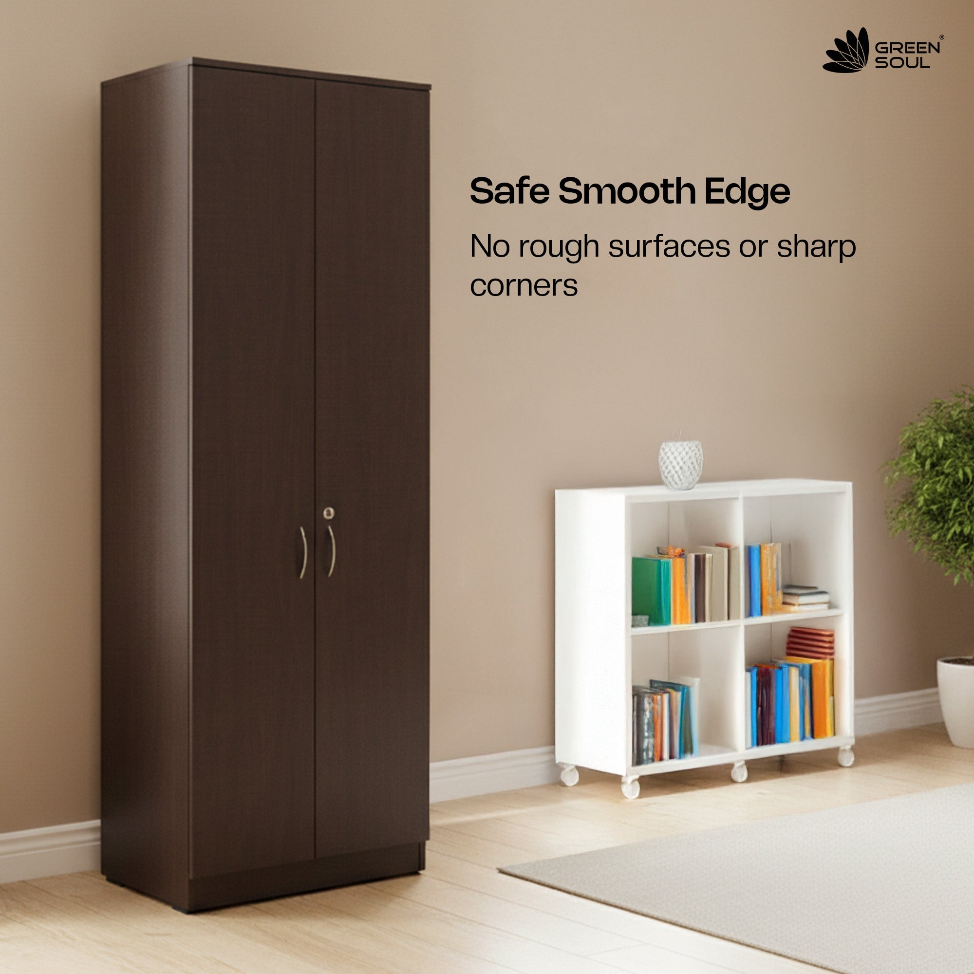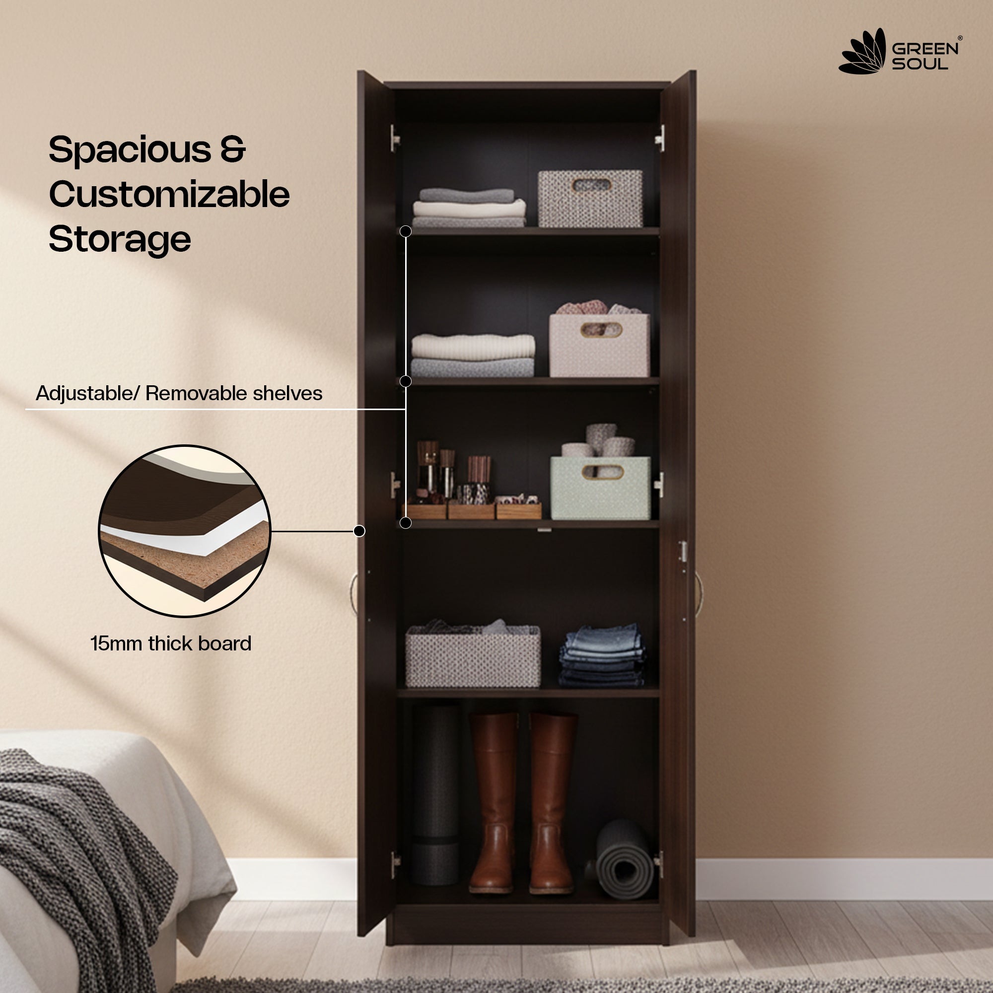 - The Green Soul Premium 2-Door Wardrobe/Cabinet is a beautifully crafted piece of furniture, made of premium quality engineered wood and robust particle board. It measures 182.4cm (height) X 47.5cm (depth) X 60cm (width) and has a load capacity of 60KG.