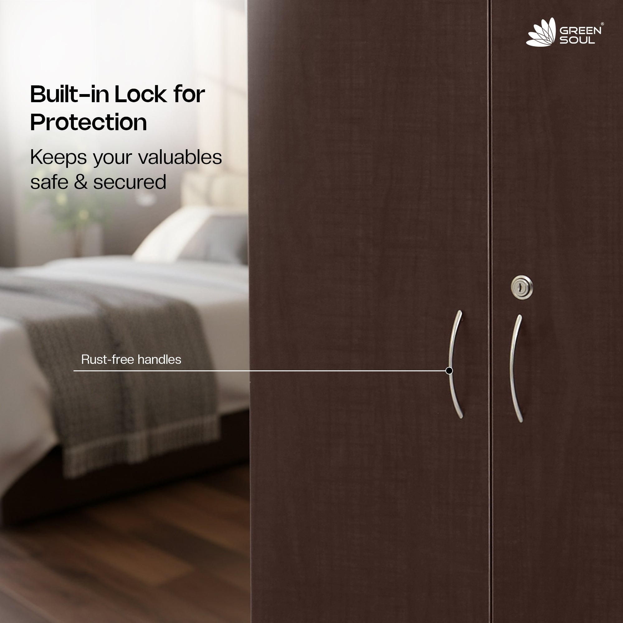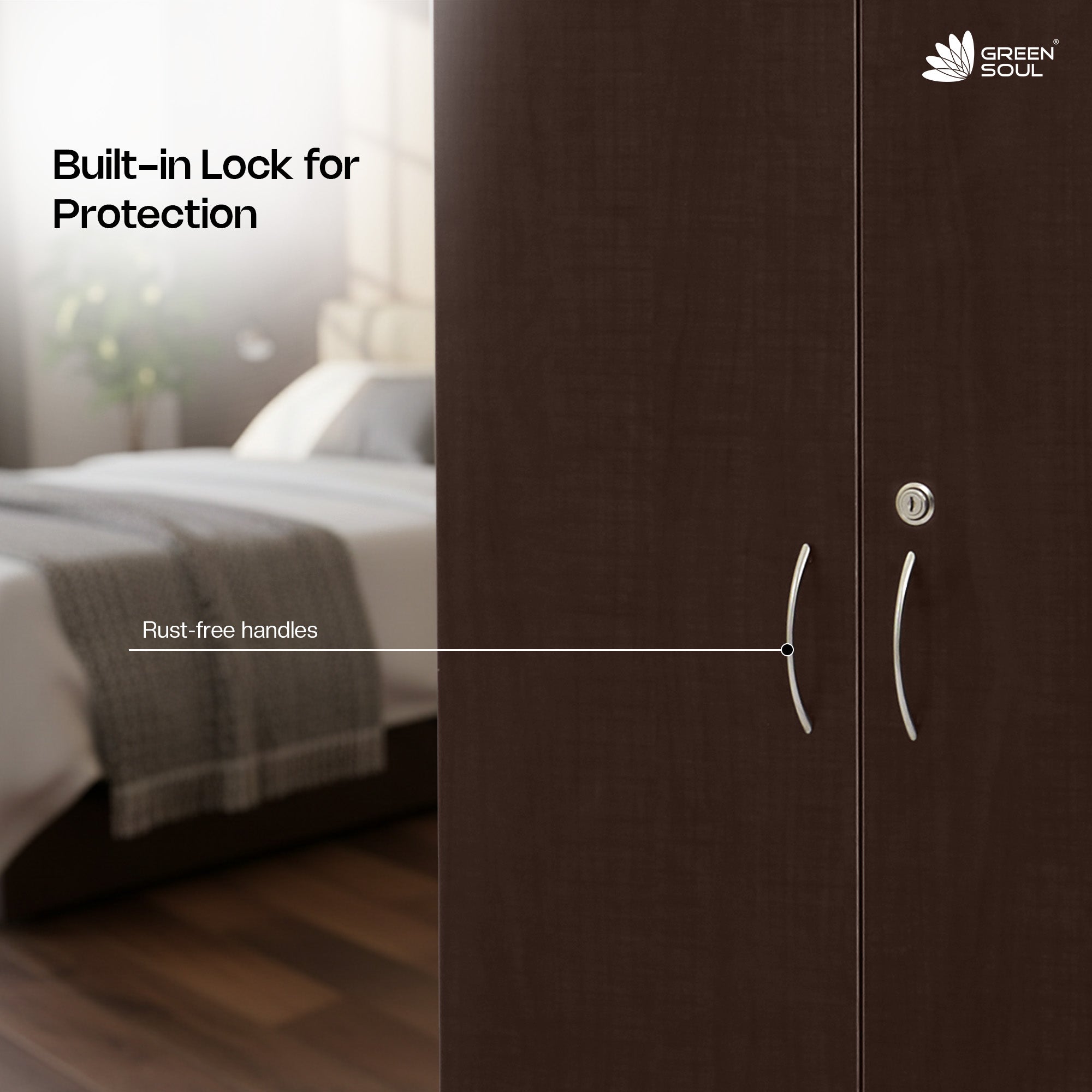 Introducing the Green Soul Premium Merlin 2-Door Bedroom Wardrobe/Cabinet - the perfect closed organizer for modern homes. Made of high-quality engineered wood and robust particle board, this wardrobe is built to last and is resistant to stains, humidity, and hot water. The 15mm thickness ensures durability and sturdiness, while the Gold Cherry color and sleek suede finish add a touch of sophistication to any space. Featuring 5 shelves, and a lock for added security , this wardrobe provides ample storage space for all your clothes, personal items, documents and more. The closed design ensures hygiene, and the product dimensions are 182.5cm (height) X 47.5cm (depth) X 60cm (length), making it the perfect size for any space. The honey-comb protection on the corners and sides of the carton box ensures damage-proof packaging, and the cabinet's 60 kg weight capacity ensures strength and stability. At Green Soul, we prioritize safety and quality. Our wardrobe is free from toxins, chemicals, burrs, and sharp edges, and comes with a 3-years limited warranty against manufacturing defects. To keep your wardrobe looking its best, we recommend using a dry cloth to wipe it clean. Do not move the wardrobe without dismantling it and avoid using water or placing hot items on it. Upgrade your home with the Green Soul Premium 2-Door Wardrobe/Cabinet and experience the difference in your home's storage and organization