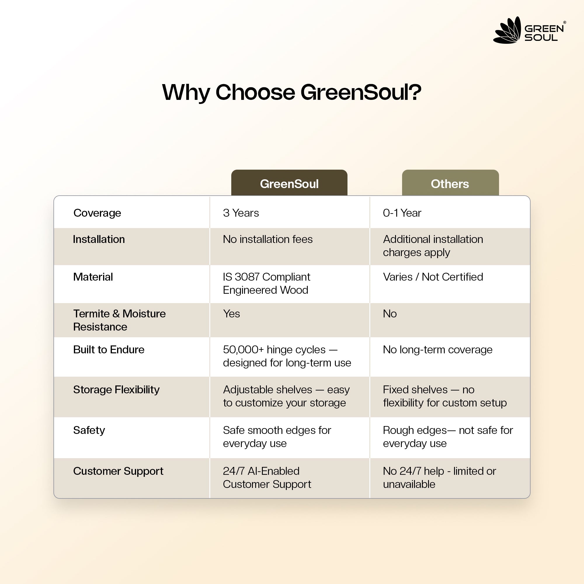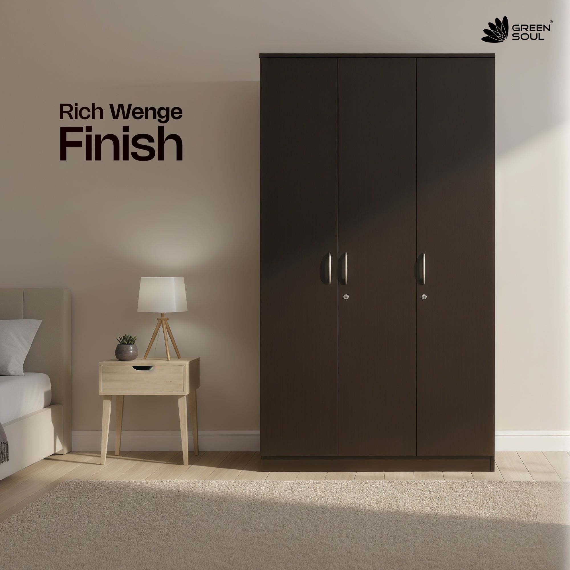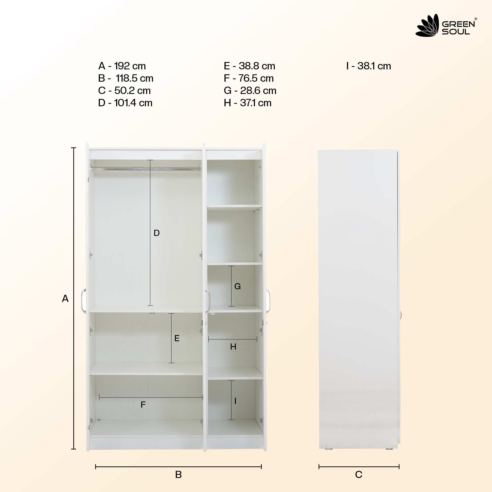 - The Green Soul Premium 3-Door Wardrobe/Cabinet is a beautifully crafted piece of furniture, made of premium quality engineered wood and robust particle board. It measures 192 cm (height) X 50.5cm (depth) X 118.5cm (width) and has a load capacity of 100KG.